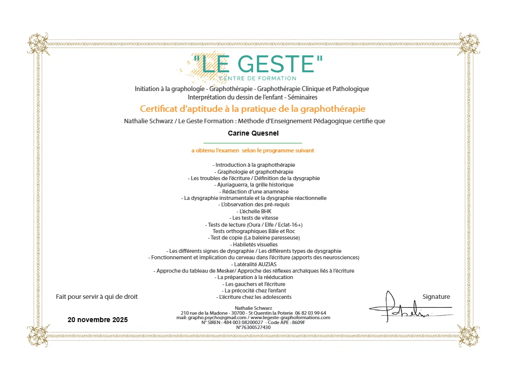 Face à leurs difficultés, mais aussi à leur courage, j’ai choisi de me former avec exigence et engagement. Je suis certifiée à la pratique de la graphothérapie.